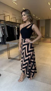 Saia Envelope Viscolinho Geométrica Preta com Nude