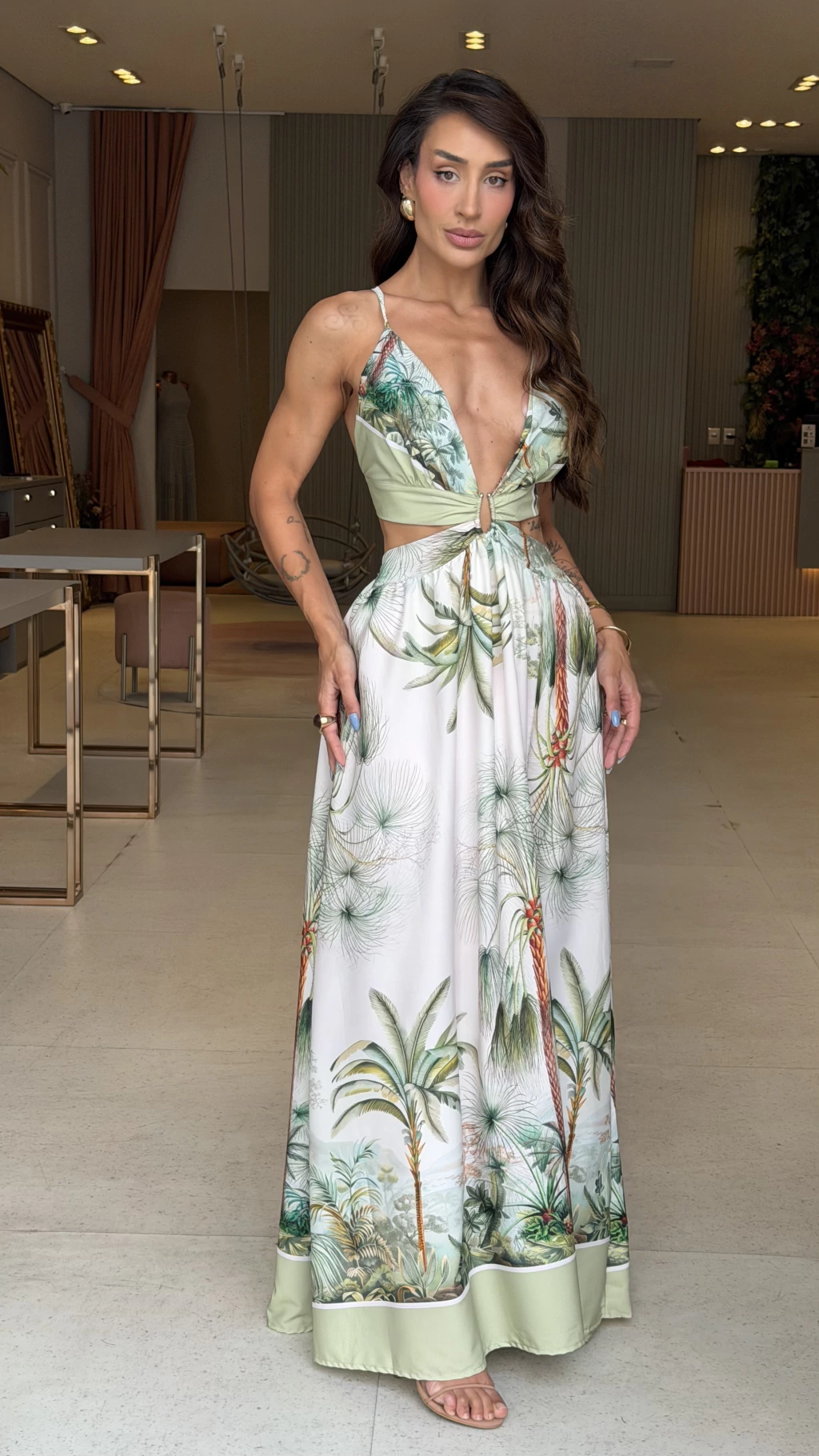 Vestido longo com estampa tropical em tons vibrantes, decote profundo e recortes laterais que realçam a silhueta. Possui alças finas e saia fluida, trazendo leveza e elegância ao look — perfeito para ocasiões ao ar livre e eventos de verão.